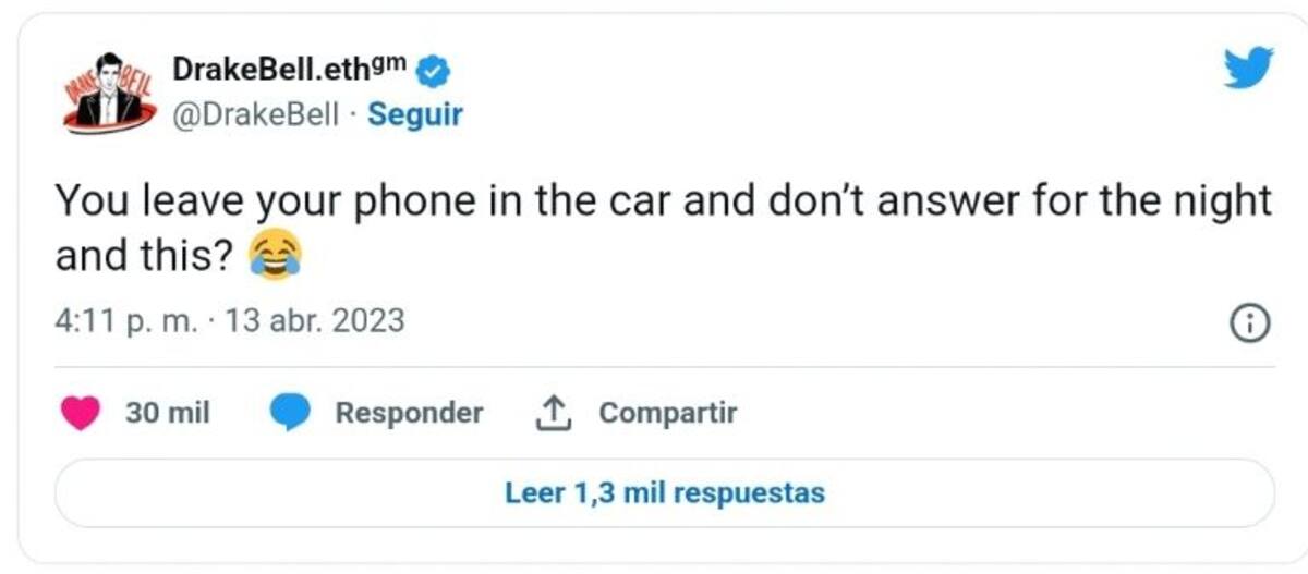 "Dejas el teléfono en el coche, no contestas en toda la noche y mira lo que pasa", escribió junto a un emoji que aparece llorando de la risa.