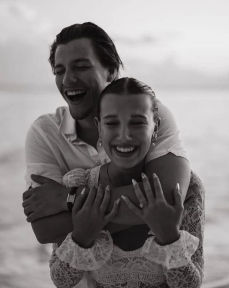 Millie Bobby Brown de 19 años se comprometió recientemente con su novio de 20 años Jake Bongiovi, el joven con el que lleva tres años de dulce relación y es hijo del cantante de rock ochentero, Jon Bon Jovi. Lo dieron a conocer con una fotografía publicada en sus cuentas de redes sociales, recibiendo además de felicitaciones algunos comentarios que hacían referencia a la corta edad de ambos.