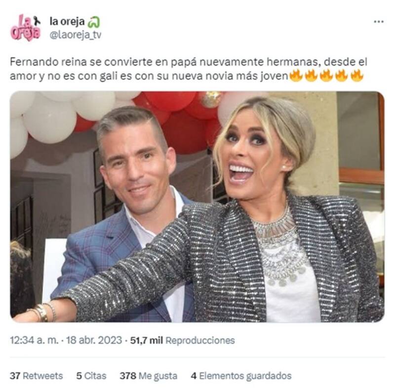 De acuerdo con esta información, Fernando Reina Iglesias se convertiría nuevamente en papá. “Fernando Reina se convierte en papá nuevamente hermanas, desde el amor y no es con Gali es con su nueva novia más joven”, menciona la publicación.