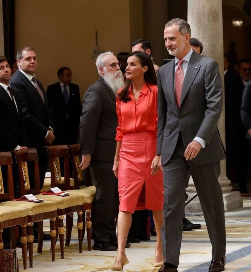 Para esta ocasión en el Palacio Real de El Pardo, doña Letizia elegió una falda de cuero como pieza central de su look. Este tipo de prenda no es una novedad en su armario, pues tiene varias como una en corte lápiz en color negro y otra igual en rojo. Esta última también la posee Meghan Markle.