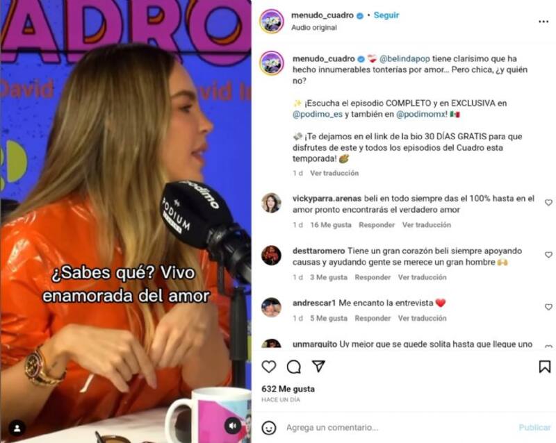 En esta ocasión, estuvo como invitada en el podcast español “¡Menudo Cuadro”, en el que confesó que ha cometido “miles, millones” de errores en el terreno del amor. "Tantas cosas ¿sabes qué? Vivo enamorada del amor, y siempre apuesto todo por la persona equivocada, eso es algo que ojalá que cambie, pero yo soy (entregada).", reveló.