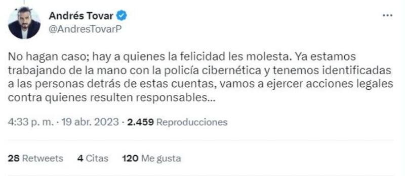 Molesto y afectado con la información que circuló en algunos sitios, Andrés Tovar advirtió que tomará acciones legales en contra de los que resulten responsables de alentar este rumor.