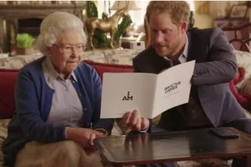 El documental reciente mostró imágenes del video promocional de los Juegos de 2016, en el que se ve a Harry junto a su abuela, la reina Isabel I , respondiendo al desafío Invictus Games de Barack y Michelle Obama.