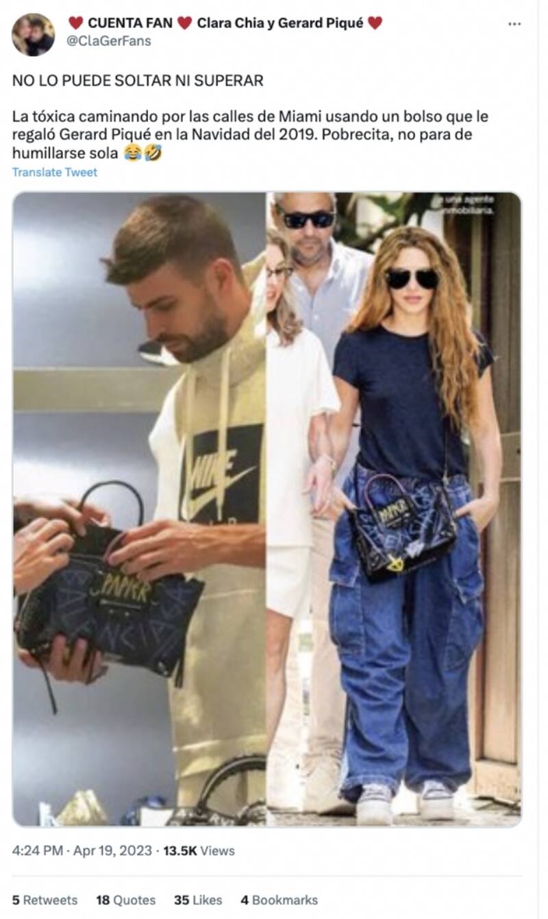 "La tóxica caminando por las calles de Miami usando un bolso que le regaló Gerard Piqué en la Navidad del 2019. Pobrecita, no para de humillarse sola", escribieron en un tweet la cuenta @ClaGerFans que se dedica a elogiar a la nueva pareja conformada por el empresario y Clara Chía.