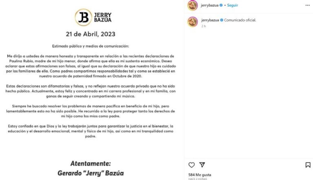 A través de su cuenta oficial de Instagram, el cantante se pronunció con un comunicado en el que desmiente las declaraciones de la también llamada “Chica dorada”, asegurando que él siempre ha sido un padre responsable con lo que respecta la crianza y manutención de su hijo Eros.