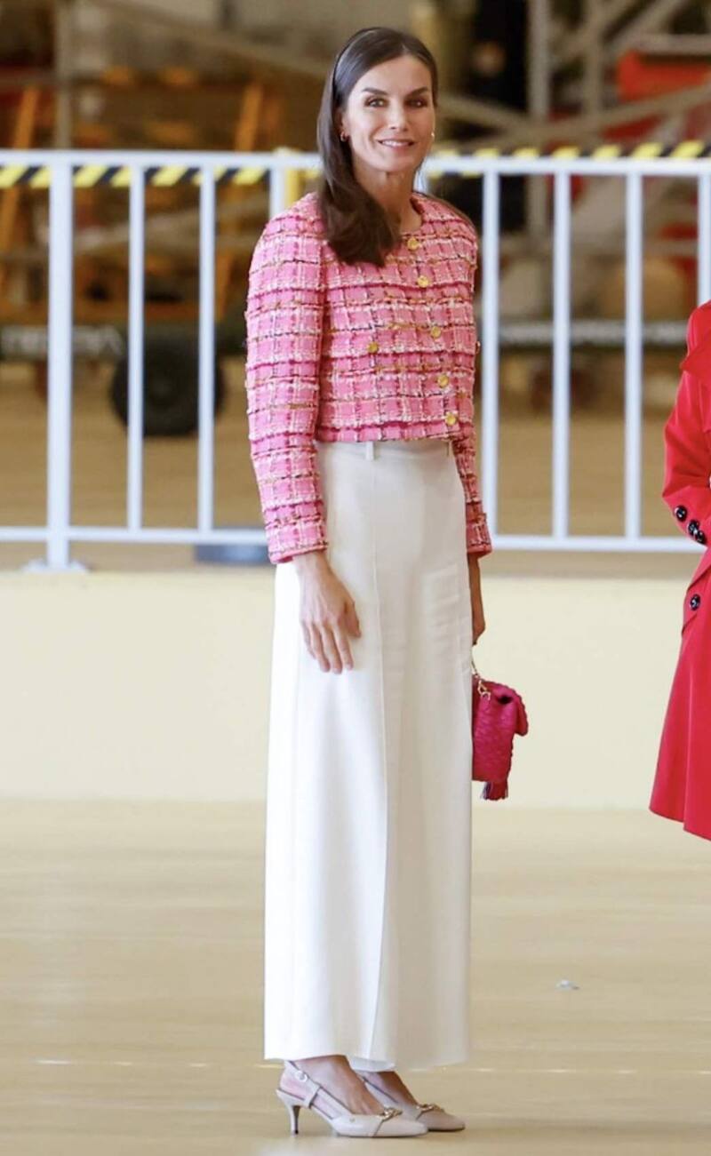 La reina encabezó la clausura del Centenario de la primera aero-evacuación médica en España en la Base Aérea de Cuatro Vientos en Madrid y para la ocasión lució una nueva chaqueta cropped de tweed de tonalidades rosas de la firma Mirto, que es perfecta para la temporada de primavera.