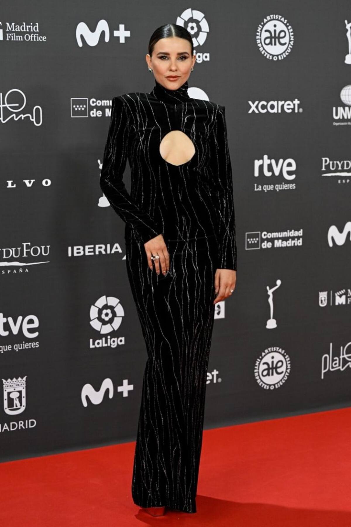 La protagonista de “Madre solo hay dos” lució un espectacular vestido negro de cuello perkins, manga larga y falda hasta el suelo con una abertura sobre el pecho y escote en la espalda. Su look lo completó con unas sandalias metalizadas de plataforma y recogió su melena en un moño bajo con raya al medio y efecto pulido.