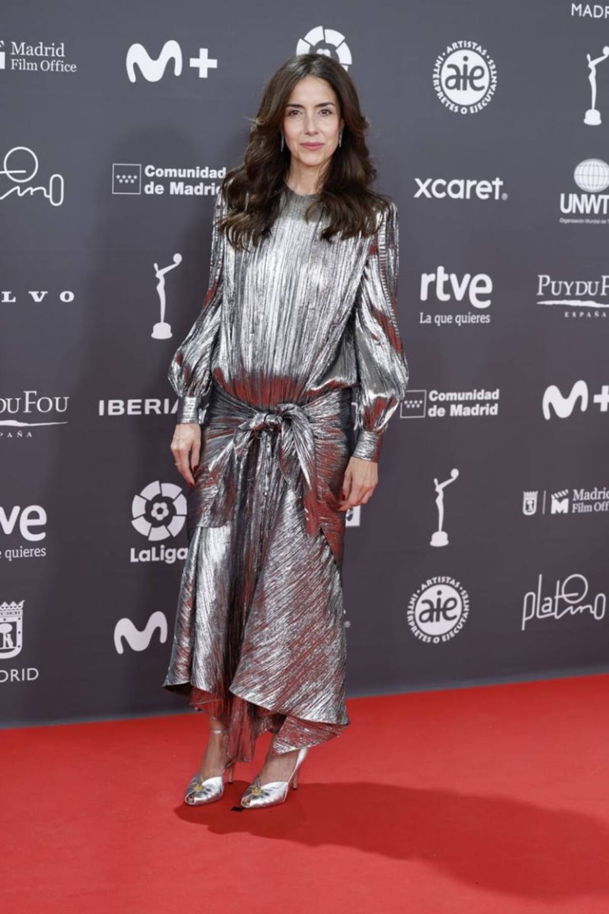 La protagonista de “La casa de las flores” apostó por un total look plateado con un original diseño de cuello redondeado, hombros marcados, mangas abullonadas y falda midi asimétrica y una lazada que entalla la cadera. Su look lo completó con unas sandalias a juego y aretes colgantes plateados.