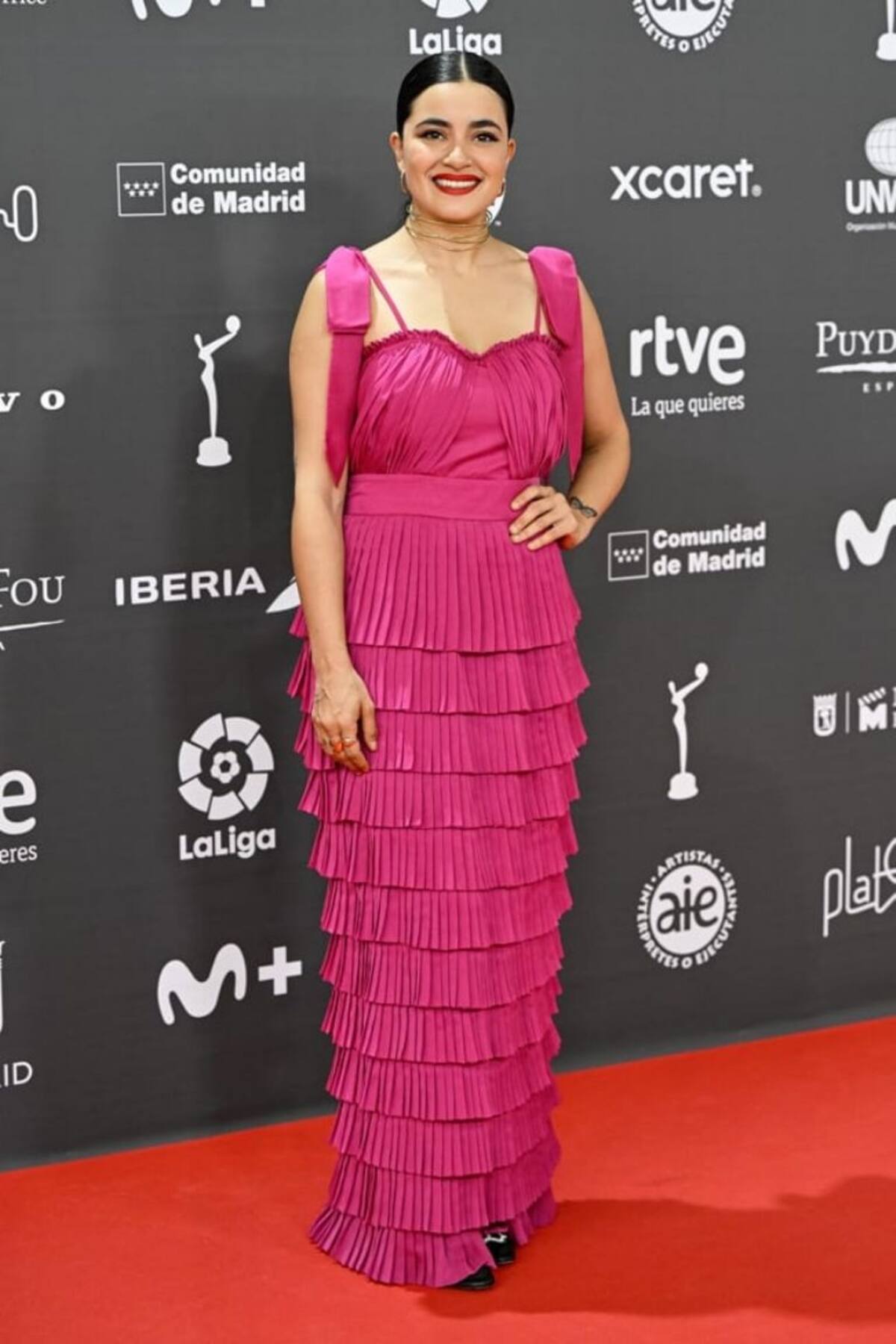 La actriz de la serie “Narcos” apostó por un vestido buganvilla, confeccionado con volantes plisados que combinó con unos zapatos de tacón negros de puntera, una gargantilla rígida en tono dorado a juego con unos pendientes cuadrados. En cuanto a su peinado, optó por una coleta pulida de raya en medio y un maquillaje clásico en el que destaca los labios rojos a contraste con el vestido.
