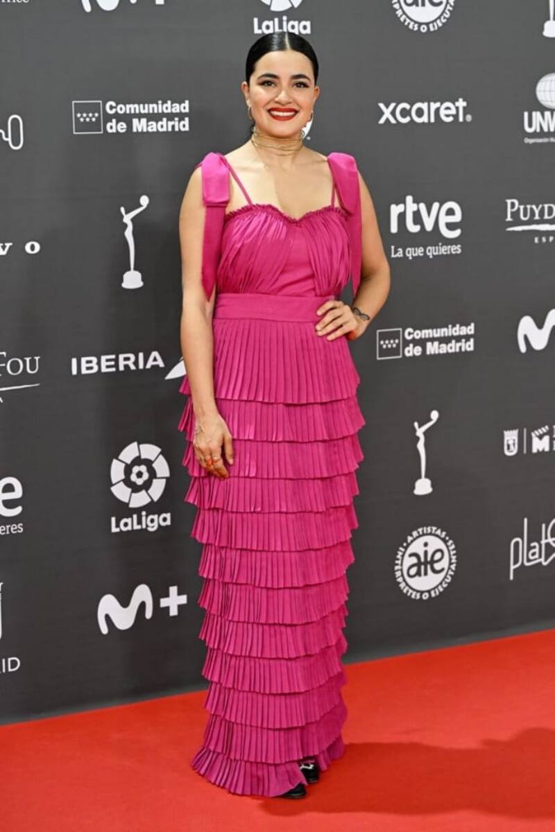 La actriz de la serie “Narcos” apostó por un vestido buganvilla, confeccionado con volantes plisados que combinó con unos zapatos de tacón negros de puntera, una gargantilla rígida en tono dorado a juego con unos pendientes cuadrados. En cuanto a su peinado, optó por una coleta pulida de raya en medio y un maquillaje clásico en el que destaca los labios rojos a contraste con el vestido.