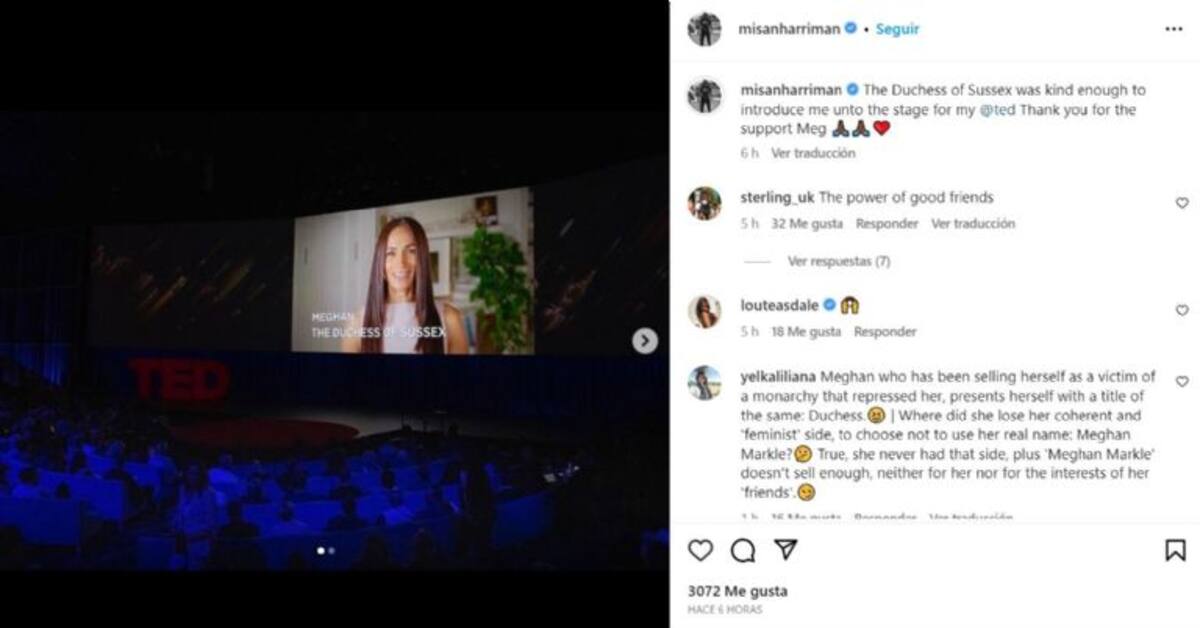"La duquesa de Sussex tuvo la amabilidad de presentarme al escenario para mi @ted. Gracias por el apoyo, Meg", escribió.