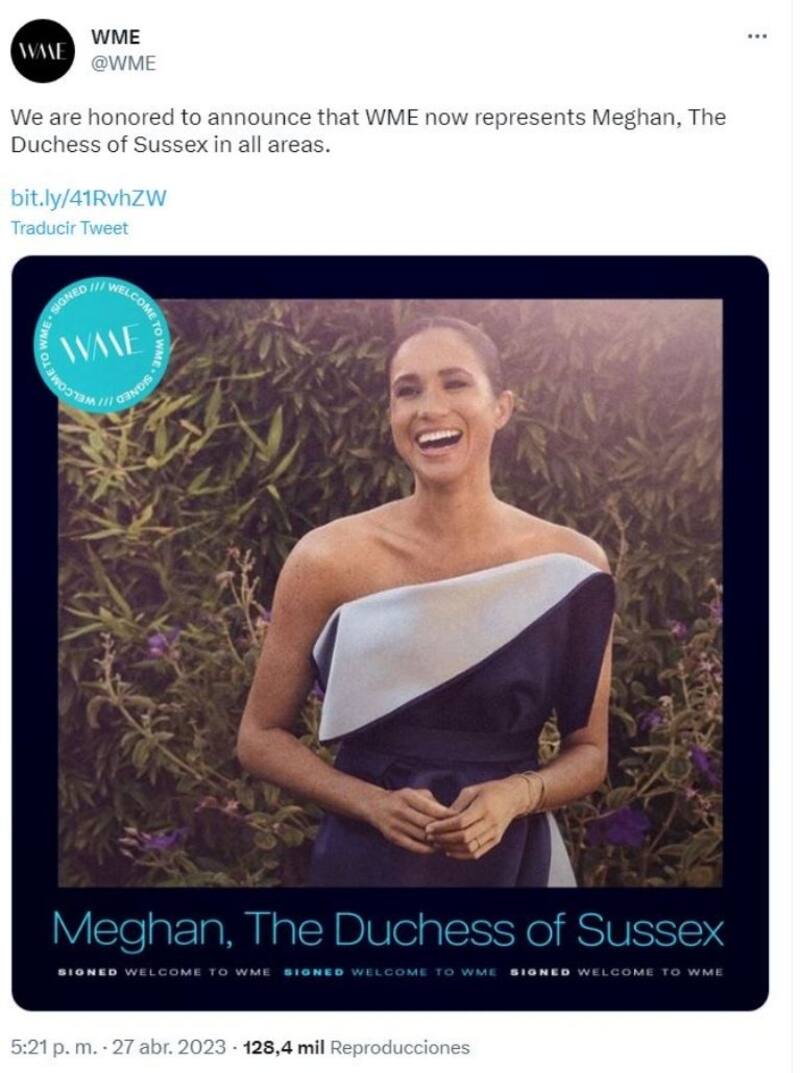“Nos sentimos honrados de anunciar que WME ahora representa a Meghan, la duquesa de Sussex en todas las áreas”, escribieron al pie de una foto en la que se mira a la ex actriz de televisión muy sonriente.