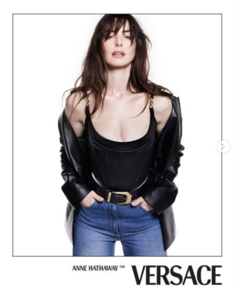 Han publicado algunas fotografías en redes sociales donde se ve a Anne Hathaway con un semblante muy seductor usando un corsé negro con detalles de la icónica Medusa de la marca, combinado con un par de jeans azules que le dan toda la imagen casual.