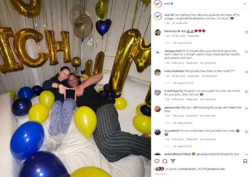 Al respecto y como cualquier padre orgulloso, A-Rod recurrió a su perfil de Instagram para desearle lo mejor en la siguiente etapa a su querida hija. "No puedo creer que esté a punto de graduarse e ir a la universidad. Tengo todas las emociones. Por ahora, ¡¡VAMOS AZUL!!", escribió al pie de una foto en la que aparece junto a su hija rodeados de globos.