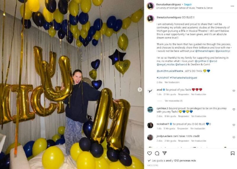 "¡Me siento extremadamente honrada y orgullosa de compartir que continuaré mis estudios artísticos y académicos en la Universidad de Michigan, para realizar un BFA en Teatro Musical! Todavía no me puedo creer que se me haya dado esta oportunidad. ¡Es absolutamente un sueño hecho realidad", escribió la joven.