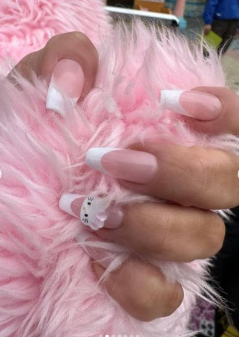 Y Kim Kardashian eligió la comodidad con pants y top grises, sneakers del mismo color y un abrigo full color rosa del mismo material y color de su bolso. Al igual que su hija pequeña, no podía dejar de agregar a su look lentes obscuros futuristas con marco plateado. Pero lo que más llamó la atención fue su nail art que parece ser un sencillo estilo francés con punta blanca pero en una mano le agregó todo su estilo con una cabeza de Hello Kitty y en la otra las típicas flores rosas de los personajes.