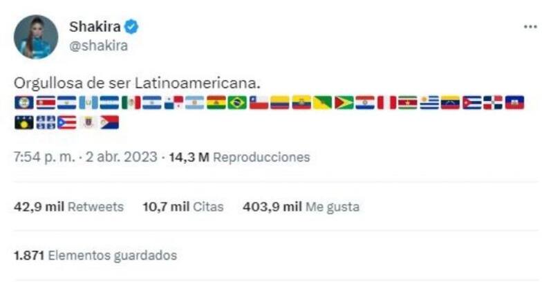“Orgullosa de ser latinoamericana", escribió dicha frase acompañada de las 29 banderas que componen la nación conocida como Latinoamérica, algo que ha sido interpretado como una respuesta a lo dicho por el exfutbolista, quien ha sido considerado xenófobo.