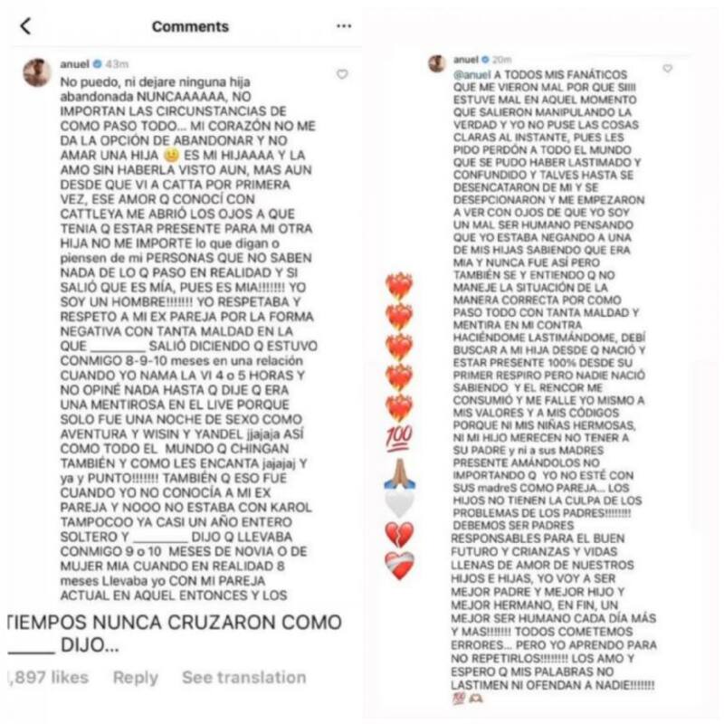 Respecto a los rumores de infidelidad, Anuel AA aclaró que no engaño ni a Karol G ni a Yailin La Más Viral: "Eso fue cuando yo no conocía a mi expareja y no estaba con Karol tampoco ya llevaba casi un año entero soltero y dijo que llevaba conmigo 9 o 10 meses de novia o de mujer mia cuando en realidad 8 meses llevaba yo con mi pareja actual en aquel entonces y los tiempos nunca cruzaron".