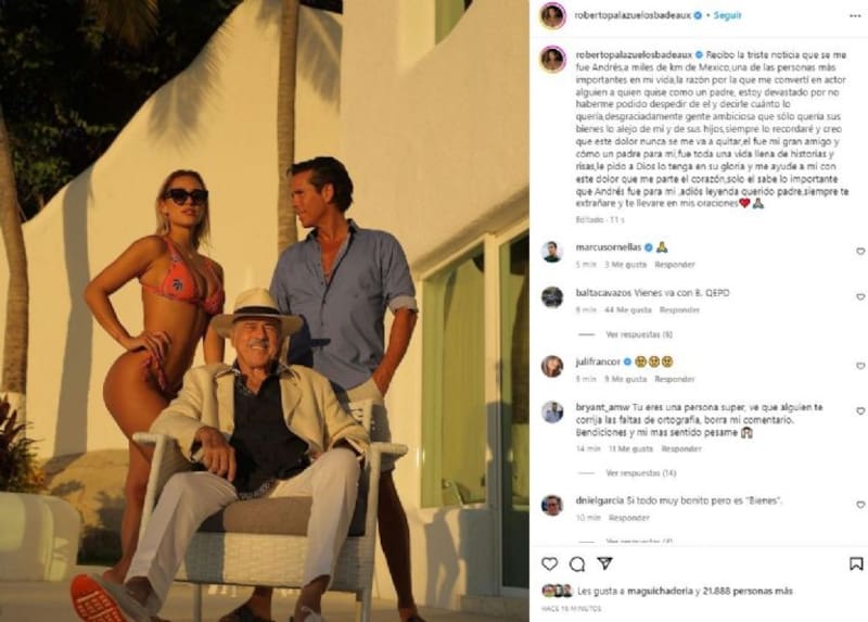 “Recibo la triste noticia que se me fue Andrés, a miles de km de México, una de las personas más importantes en mi vida, la razón por la que me convertí en actor alguien a quien quise como un padre, estoy devastado por no haberme podido despedir de él y decirle cuánto lo quería”, escribió al pie de una foto en la que aparece a lado del actor posando en una de sus lujosas residencias.
