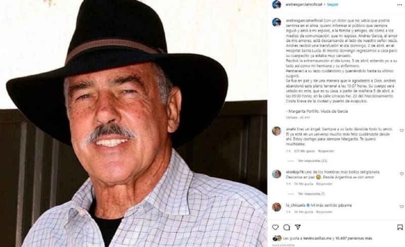 “Andrés abandonó este plano terrenal a las 15:07 horas. Su cuerpo será velado en esta, que es su casa, a partir de mañana 5 de abril en la calle Urracas No. 20 del Fraccionamiento Costa Brava de la ciudad y puerto de Acapulco”, escribió.