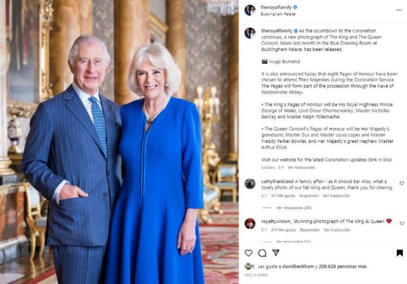 “Se anuncia hoy que ocho páginas de honor han sido elegidas para asistir a Sus Majestades durante el Servicio de Coronación. Las Páginas formarán parte de la procesión a través de la Abadía Nave de Westminster.”, reza la publicación al pie de una foto oficial de los nuevo monarcas.