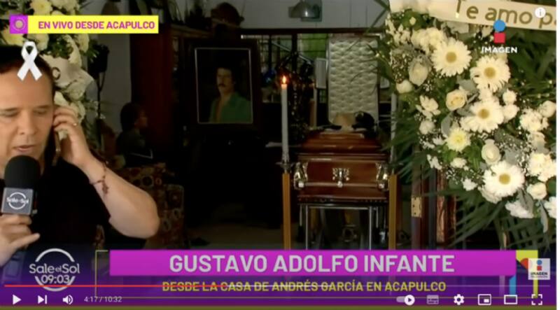 "El día de ayer embalsamaron el cuerpo de Andrés García, ya lo trajeron, ya está aquí, las dos primeras coronas que han llegado son las de Anahí..al interior hay una fotografía al oleo de Andres García, guapo, entre guapos, hay otra acá en el fondo".