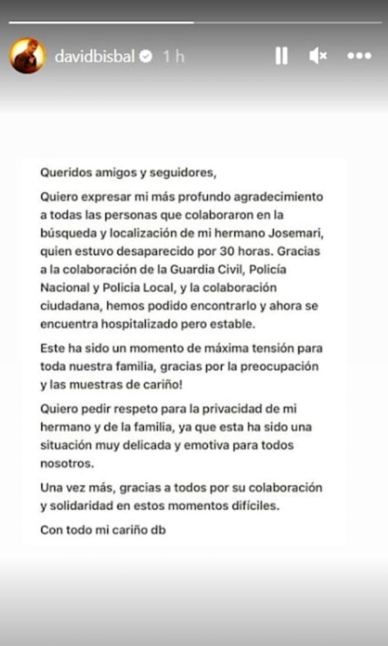 “Hemos podido encontrarlo y ahora se encuentra hospitalizado, pero estable”, indicó el intérprete de “Bulería”, a través de esta este documento que ha compartido a través de sus redes sociales y en el que ha expuesto por primera vez su sentir.
