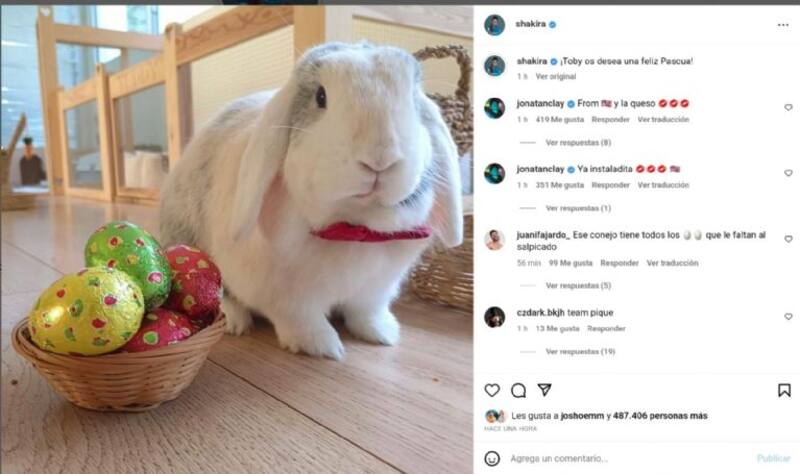 “Happy Easter Shakira! Espero que hayas disfrutado tus vacaciones en república dominicana con tus hijos, y finalmente Bienvenida a Miami”, “Toby en Miami”, “me da ilusión saber si esta foto ya es en su casa de Miamii. Felices pascuas, amada Shak”, “Los huevos que le faltaron a Salpique”, “ese conejo tiene todos los huevos que le faltan al salpicado”, fueron algunos de los comentarios que le dejaron en su “post”.