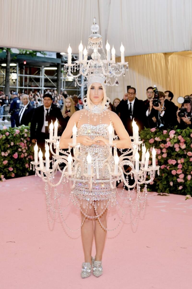 La cantante de "Firework" se puso un atuendo de Moschino inspirado en un candelabro. Una vez dentro del museo, se disfrazó de una hamburguesa con queso.