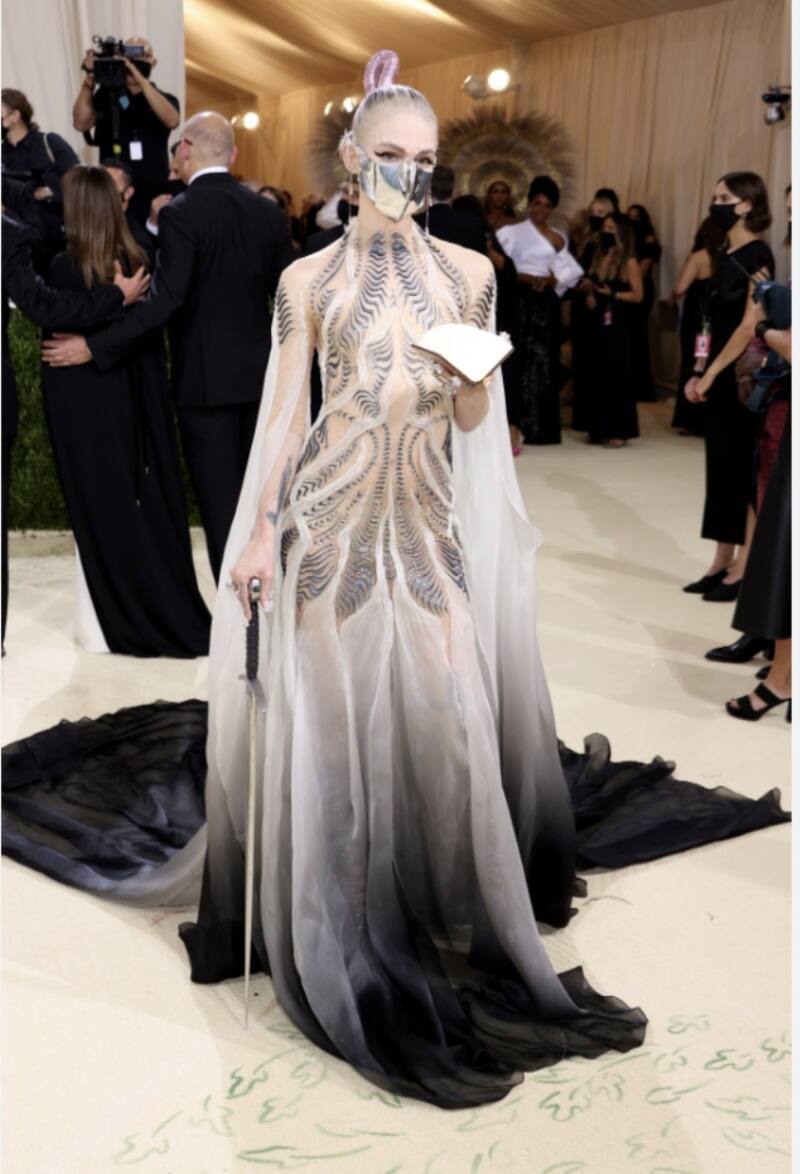 La cantante de "Génesis" no necesitó un guardaespaldas en el baile, porque trajo su propia espada de estilo medieval, que tomó prestada del Met y se hizo con un rifle de asalto AR-15 fundido. Además, complementó su vestido futurista de Iris van Herpen con una máscara facial de metal inspirada en "Dune" y orejas de elfo a juego.