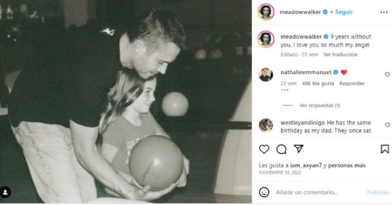 Tras casi 10 años desde la muerte de Paul Walker, su hija ha afirmado para E!News que recibe señales de su padre y lo siente allá donde va: "Para mí son los números. El cuatro y el siete son los números favoritos de mi padre. Y juro que cada vez que dudo de algo o cuando discuto con alguien o algo, empiezo a ver cuatro y siete en todas partes. Así que siempre sé que es él".