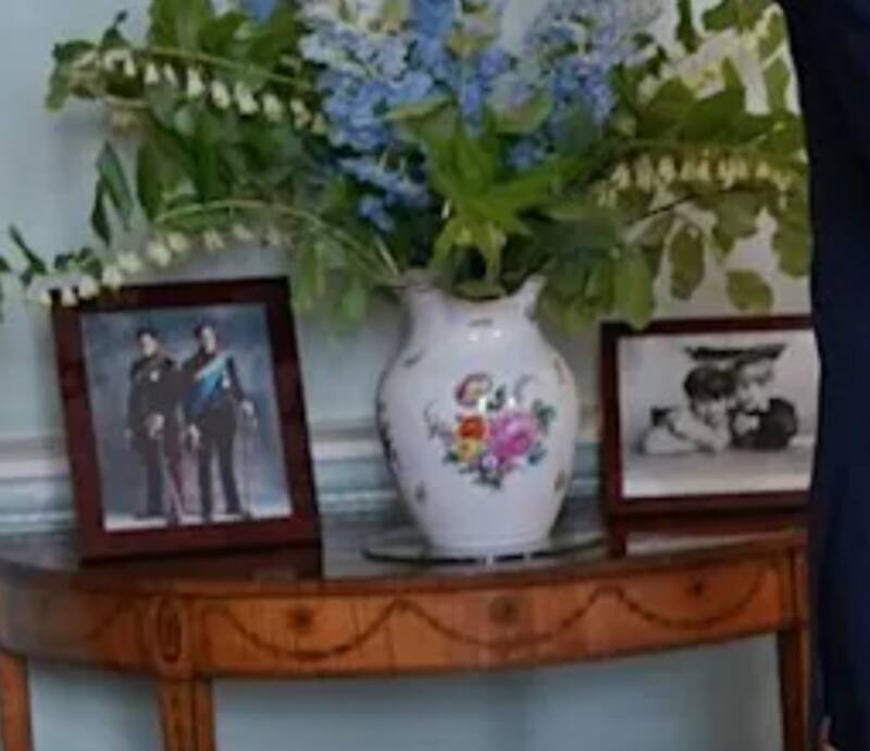 Se trata de un par de cuadros fotográficos uno al lado del otro divididos por un jarrón de flores posados sobre una mesita de madera. En una de las fotos se puede ver al príncipe William y al príncipe Harry con amplias sonrisas cuando apenas eran unos niños, y en la otra aparece como adultos vistiendo sus respectivos uniformes militares.