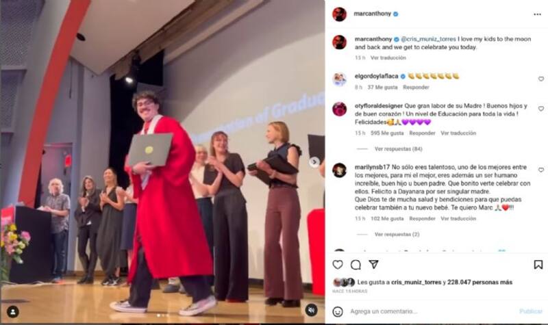 En un video publicado en el Instagram de Marc Anthony, quien espera un bebé al lado de la paraguaya Nadia Ferreira, el graduado de 23 años subió al podio y se dio la vuelta para mostrarle su diploma a su orgulloso padre.