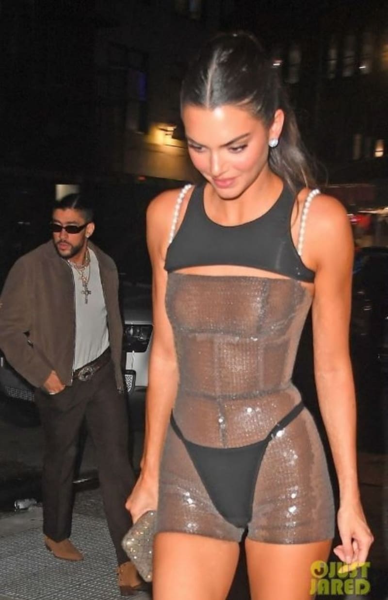 Para esta salida, la modelo usó un radiante atuendo de transparencias del diseñador Nensi Dojaka. Con este look Kendall Jenner dejó al descubierto su ropa interior.