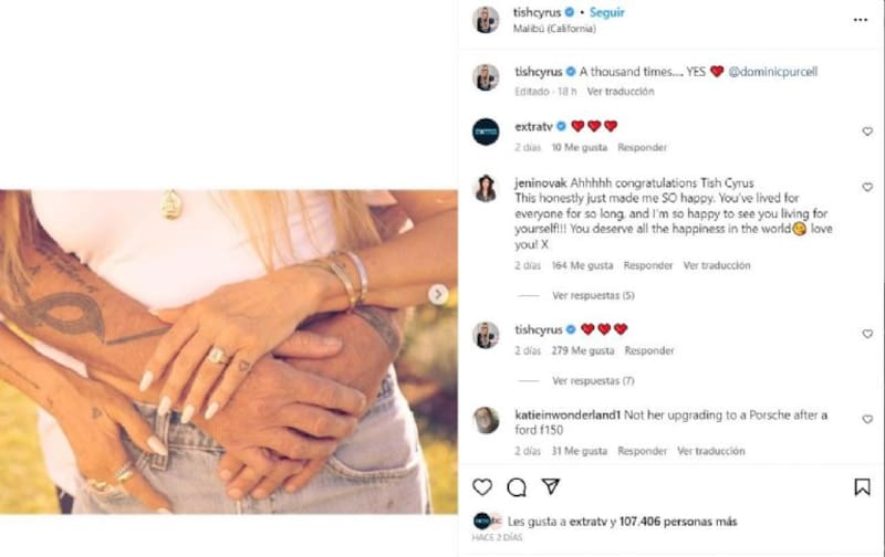Fue el pasado 29 de abril cuando Tish Cyrus anunció a través de su perfil de redes sociales que se había comprometido con el actor que protagonizó la serie “Prision Break”, en el 2005.