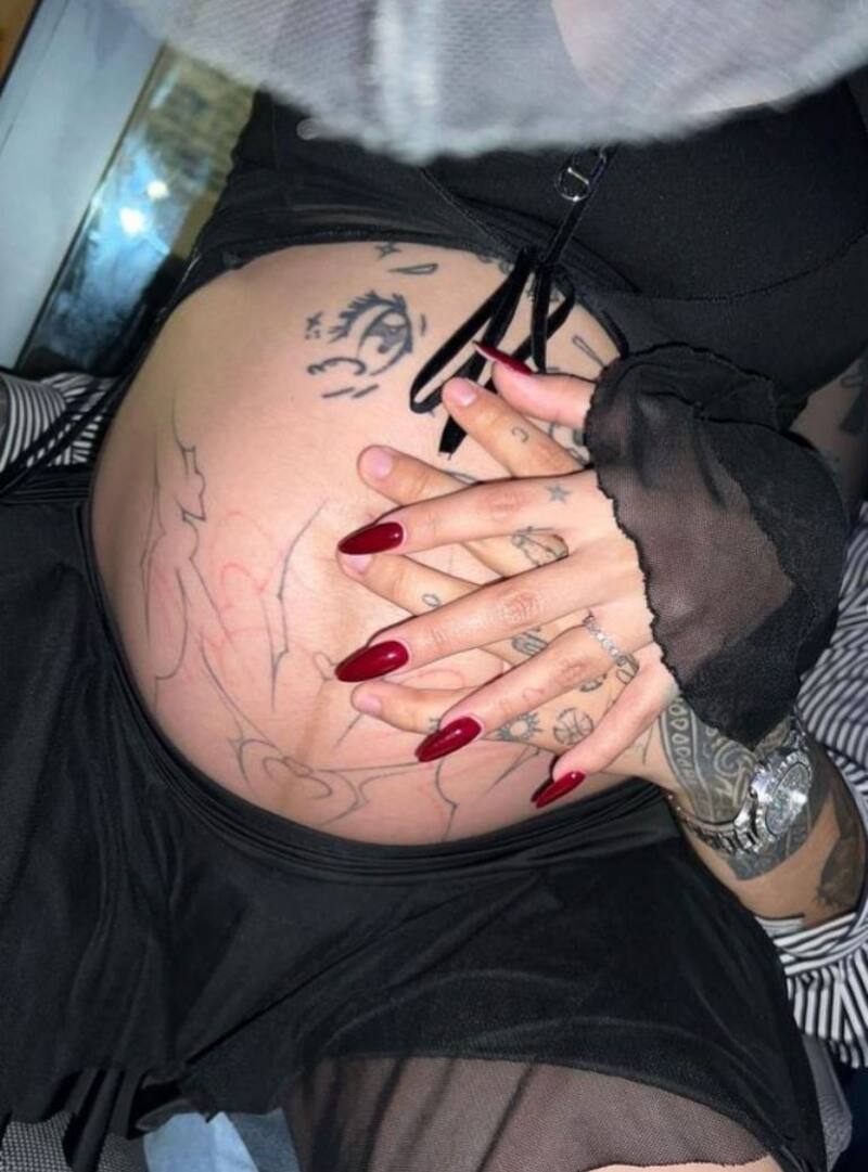 En las imágenes se le puede ver luciendo un vestido color negro con transparencias sobre el pecho y los brazos, y una gran apertura sobre el abdomen, la cual permite ver cómo va creciendo su bebito.