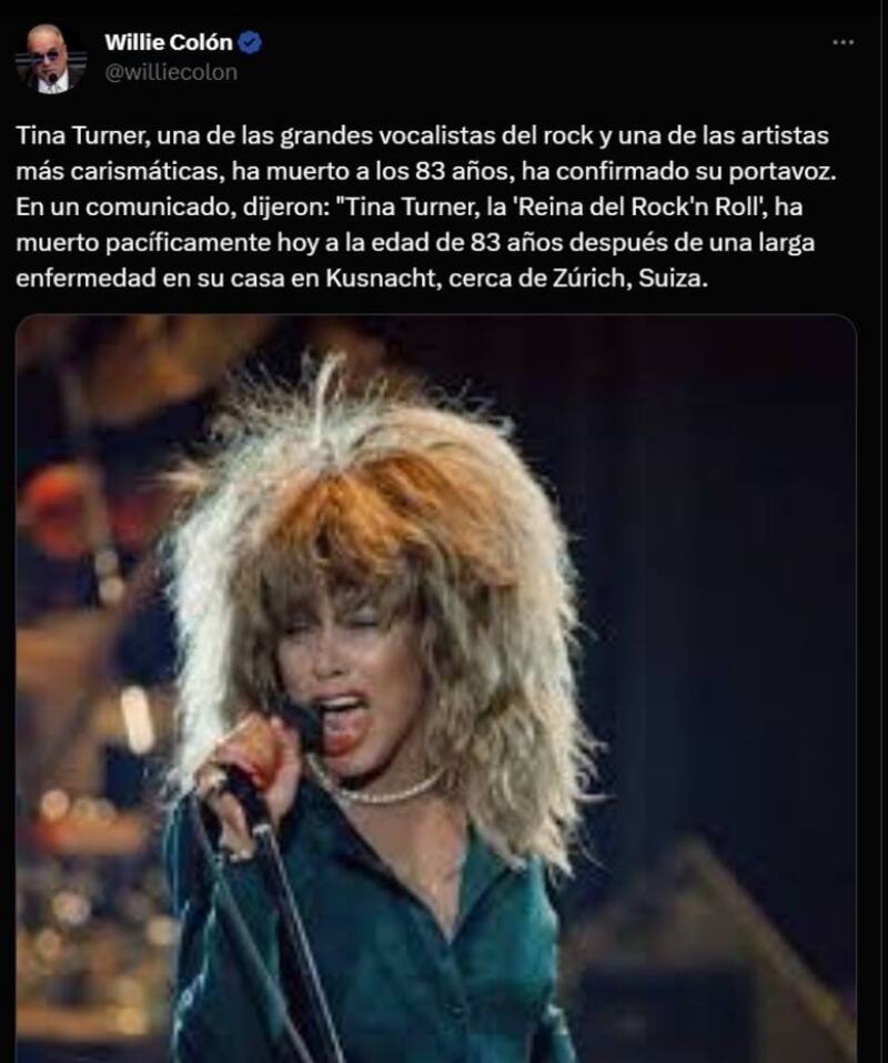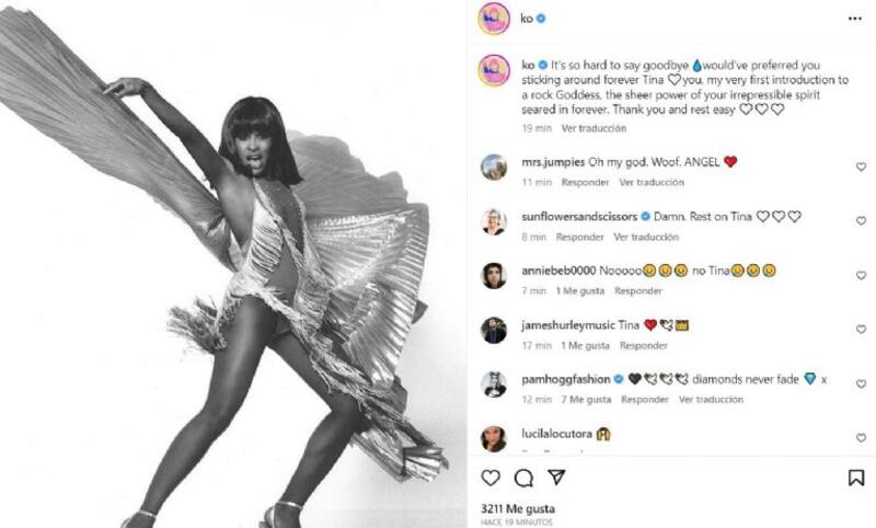 “Con gran tristeza anunciamos el fallecimiento de Tina Turner. Con su música y su pasión ilimitada por la vida, encantó a millones de fans alrededor del mundo e inspiró a las estrellas del mañana. Hoy despedimos a una querida amiga que nos deja todo su mayor trabajo: su música. Toda nuestra sincera compasión va con su familia. Tina, te echaremos mucho de menos.”, escribieron en su perfil oficial de Instagram.