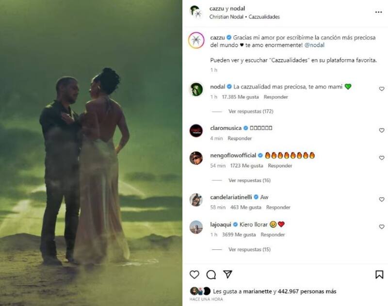 “Gracias mi amor por escribirme la canción más preciosa del mundo ?? te amo enormemente! @nodal. Pueden ver y escuchar “Cazzualidades” en su plataforma favorita", escribió. A lo que en respuesta Nodal dijo: "La casualidad más preciosa. Te amo mami".