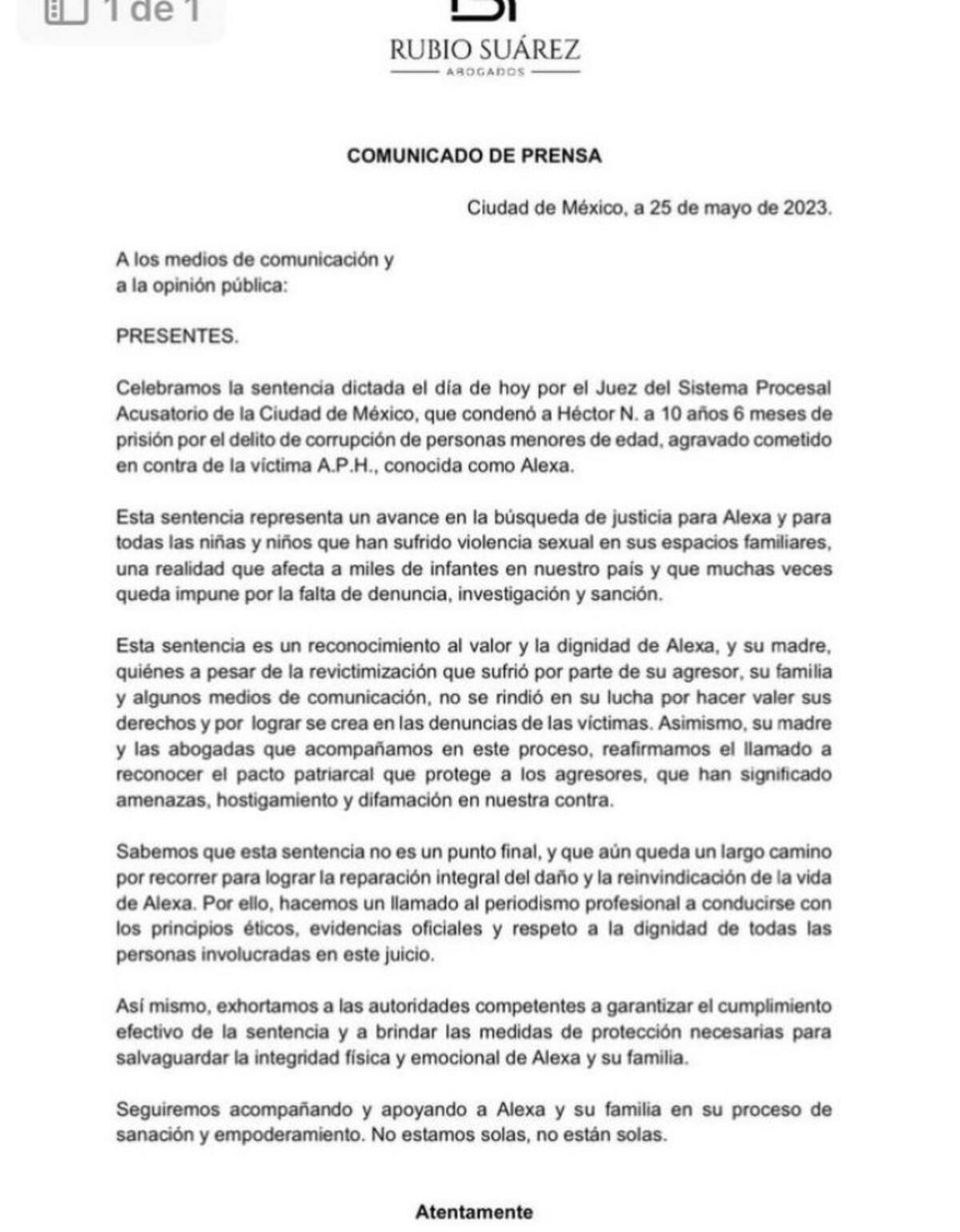 "Celebramos la sentencia dictada el día de hoy por el Juez del Sistema Procesal Acusatorio de la Ciudad de México, que condenó a Héctor 'N' a 10 años 6 meses de prisión por el delito de corrupción de personas menores de edad, agravado cometido en contra de la víctima A.P.H., conocida como Alexa", expresa el documento firmado por el despacho Rubio Suárez Abogados.