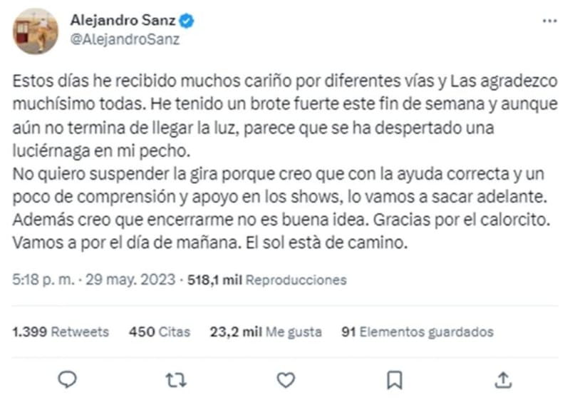 Hace unos días el cantante Alejandro Sanz generó preocupación e incertidumbre a sus millones de fans, luego de que lanzara un preocupante mensaje en su cuenta de Twitter, donde aseguró que no estaba bien, ahora el español reapareció y sostuvo que todo estaba mejor.