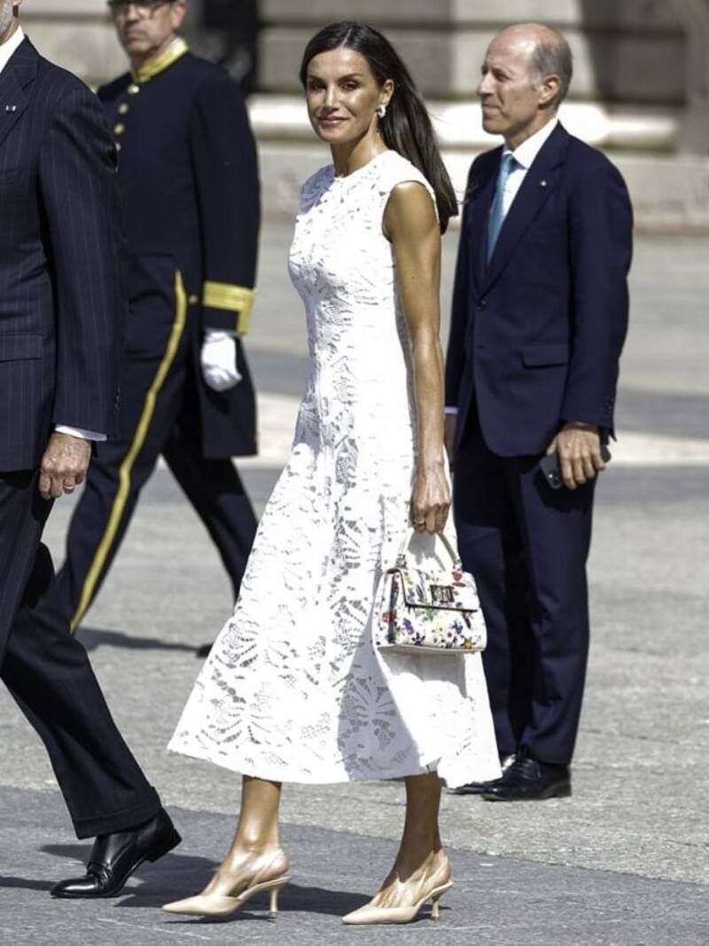 Aquel día de finales de la primavera de 2022, Letizia combinó su vestido de encaje semitransparente con complementos en color azul cielo, sin embargo, en esta ocasión decidió darle un aire más juvenil y moderno al acompañarlo con un minibolso de flores multicolores de Furla.