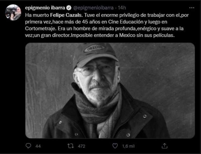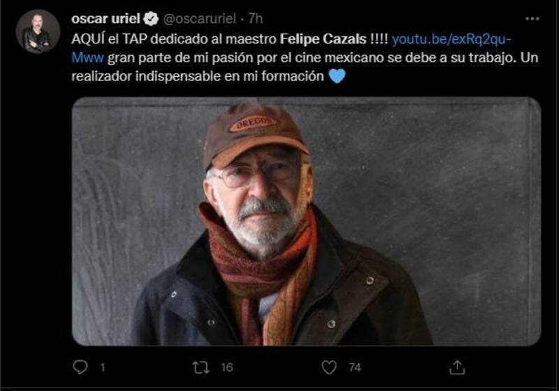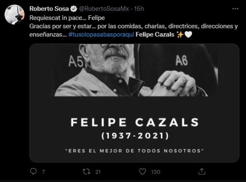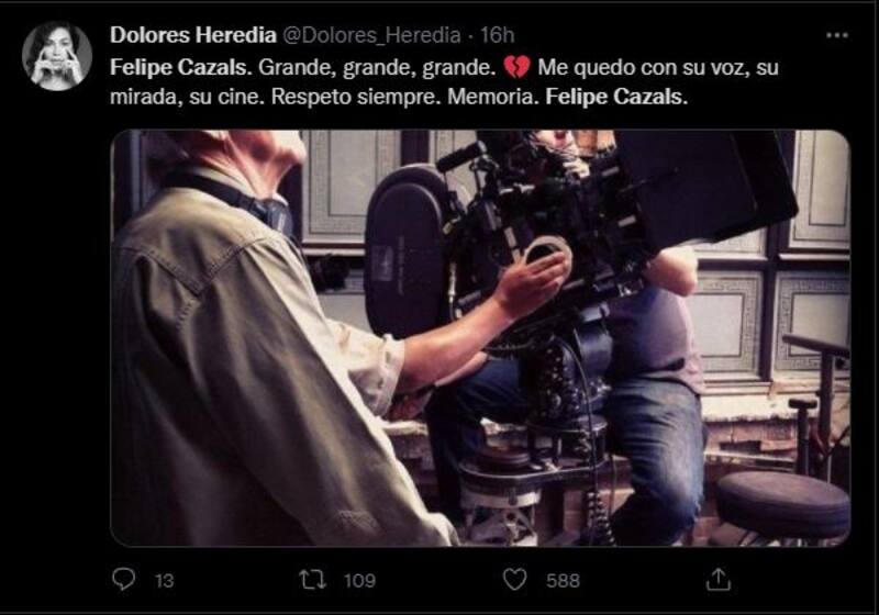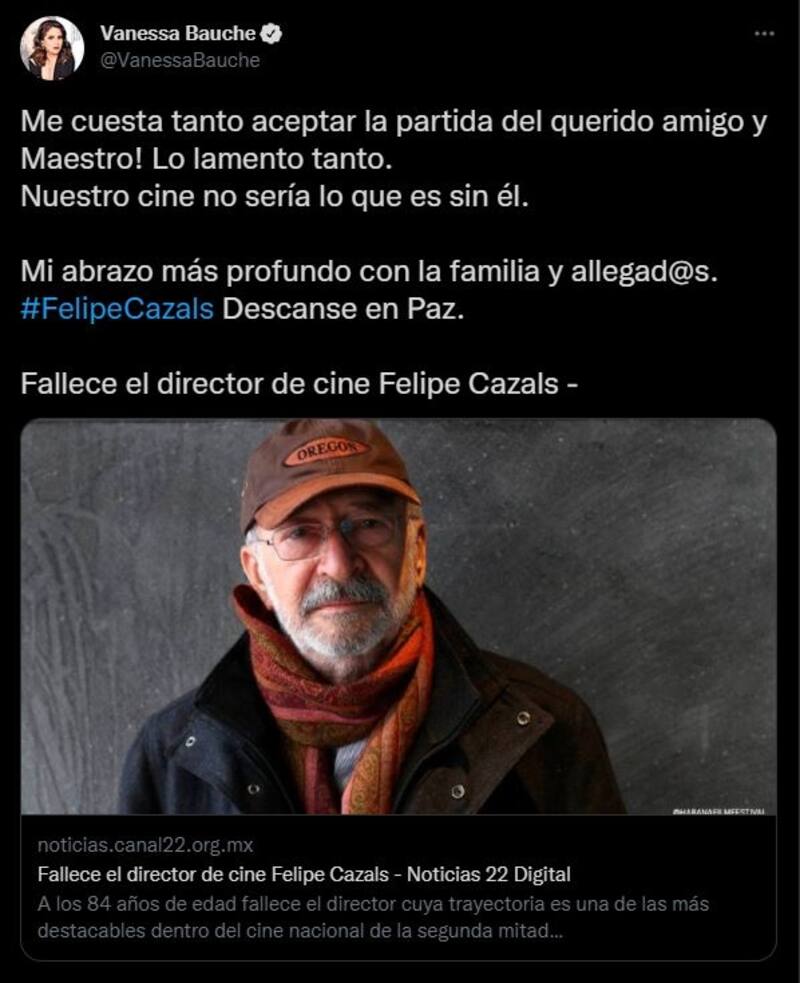 "Felipe Cazals. Grande, grande, grande. Corazón roto. Me quedo con su voz, su mirada, su cine. Respeto siempre...(sic)", escribió Lola.