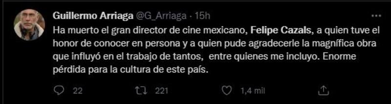 Otro director que lamentó la perdida de Felipe Cazals, fue el mexicano Guillermo Arriaga