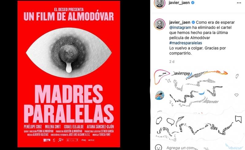 “Como era de esperar @instagram ha eliminado el cartel que hemos hecho para la última película de Almodóvar #madresparalelas Lo vuelvo a colgar. Gracias por compartirlo”, escribió Jaén.