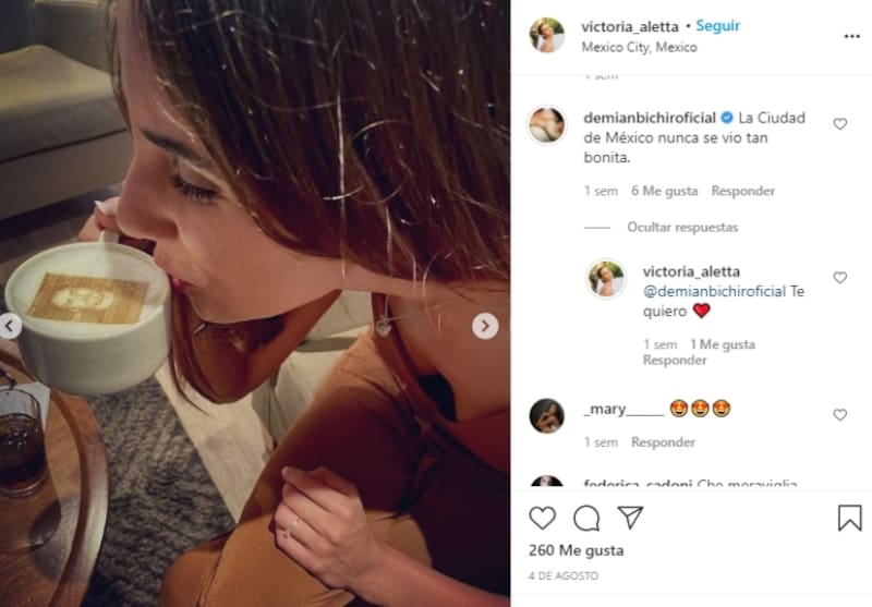 La chica es una joven italiana de 23 años, de nombre Victoria Aletta. Según el programa “Ventaneando”, el intérprete de “Los 8 más odiados” le mostró las zonas turísticas de Ciudad de México a la chica, que es bailarina profesional de ballet. La italiana posteó una serie de fotografías disfrutando del Zócalo capitalino y de Coyoacán, y entre las instantáneas se encuentra una en la que bebe un capuchino con la imagen de Bichir en la espuma.