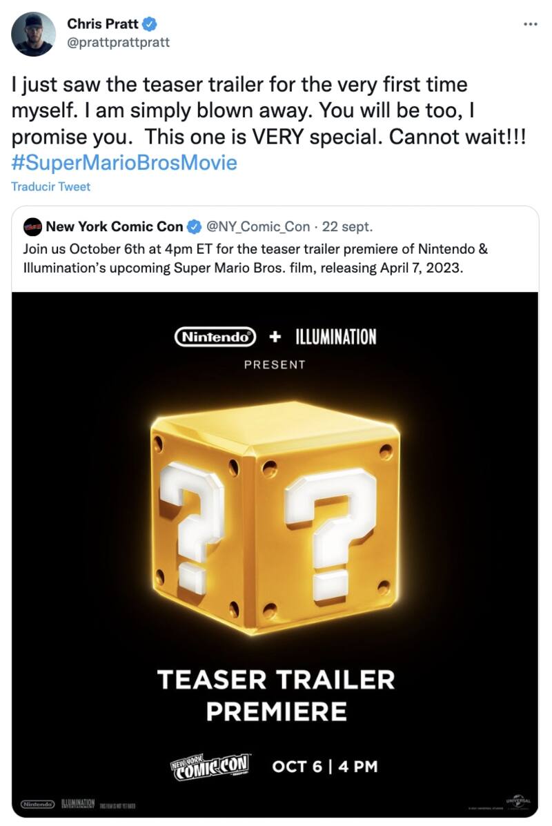 En su cuenta de Twitter, Chris Pratt, compartió lo impresionado que estaba al haber visto el primer corte de la cinta. Los seguidores esperan con ansias a que este jueves 6 de octubre a las 10:05 p.m. hora de España, sea lanzado el adelanto. En este momento Nintendo tendrá un Nintendo Direct Especial dedicado a la película.