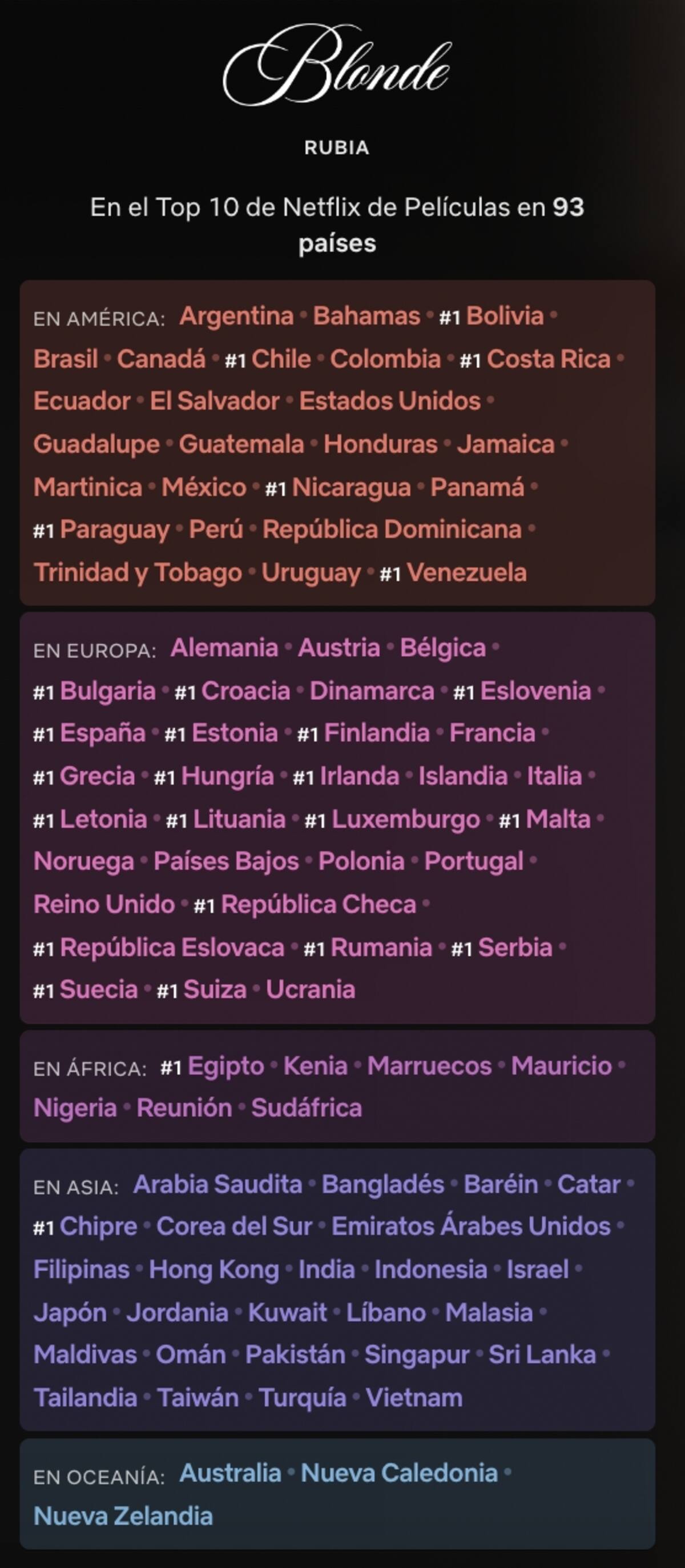 En Netflix registran que el filme ha estado dentro de los 10 primeros lugares en 93 países y ha ocupado el número 1 en muchos otros, en América Latina se incluyen Bolivia, Chile, Costa Rica, Nicaragua, Paraguay y Venezuela.