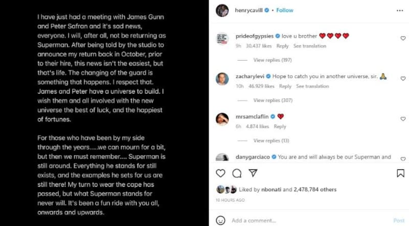 Luego, agregó: "Después de que el estudio me dijera que anunciara mi regreso en octubre, antes de su contratación, esta noticia no es la más fácil, pero así es la vida". A su vez, Henry Cavill planteó que "el cambio de guardia es algo que sucede. Lo respeto" y explicó que "James y Peter tienen un universo que construir", por lo que "les deseo a ellos y a todos los involucrados en el nuevo universo la mejor de las suertes y la más feliz de las fortunas".