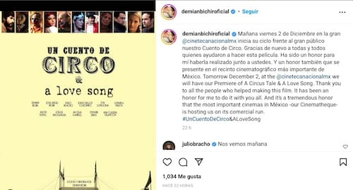 "Un cuento de circo y a love song" es el título del largometraje con el que Demián Bichir debuta como director. "No es autobiográfica, pero hay situaciones, diálogos, que así fueron en la realidad", dijo durante la presentación del filme en Cineteca Nacional de México, único recinto en el que por el momento se exhibirá el largometraje filmado hace unos años y presentado en el Festival Internacional de Cine de Morelia en 2016.