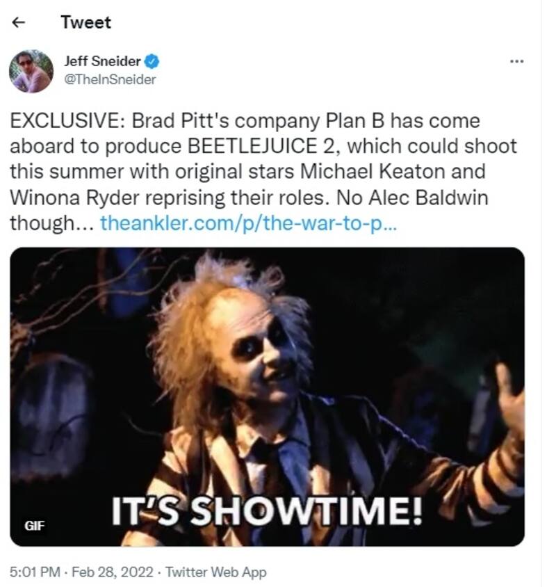 "EXCLUSIVA: La compañía de Brad Pitt, Plan B, se ha subido a bordo para producir BEETLEJUICE 2, que podría rodarse este verano con las estrellas originales Michael Keaton y Winona Ryder retomando sus papeles. Sin embargo, no estará Alec Baldwin...", parte de lo que informó el periodista.